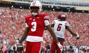 Three minutes into the second quarter, Wisconsin quarterback Graham Mertz throws a line drive to Lewis for an 18-yard touchdown. This was a career first for him.