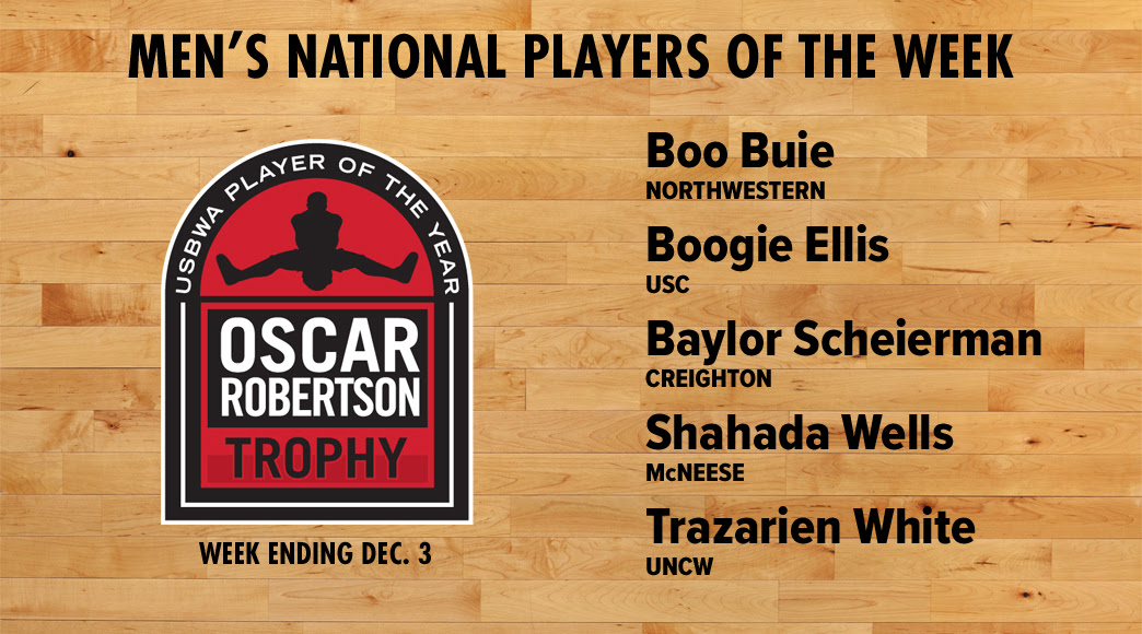 The U.S. Basketball Writers Association has named five Oscar Robertson National Players of the Week for games of the week ending Sunday, Dec. 3.