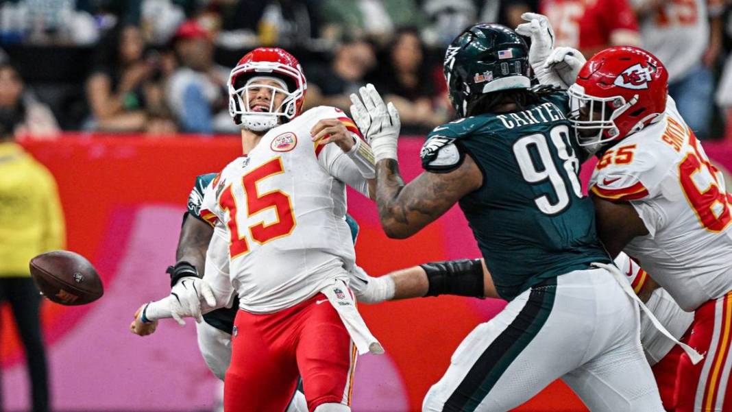 The Eagles’ secondary shut down Kansas City’s lackluster receiving corps, ensuring that even when Mahomes had time to throw, there was often little room for success. On several occasions, Mahomes’ passes found their way to Eagles defenders—one picked off and returned for a touchdown by cornerback Cooper DeJean, and another intercepted by linebacker Zach Baun deep in Chiefs territory, leading to a quick Eagles score that put Kansas City down by 24.