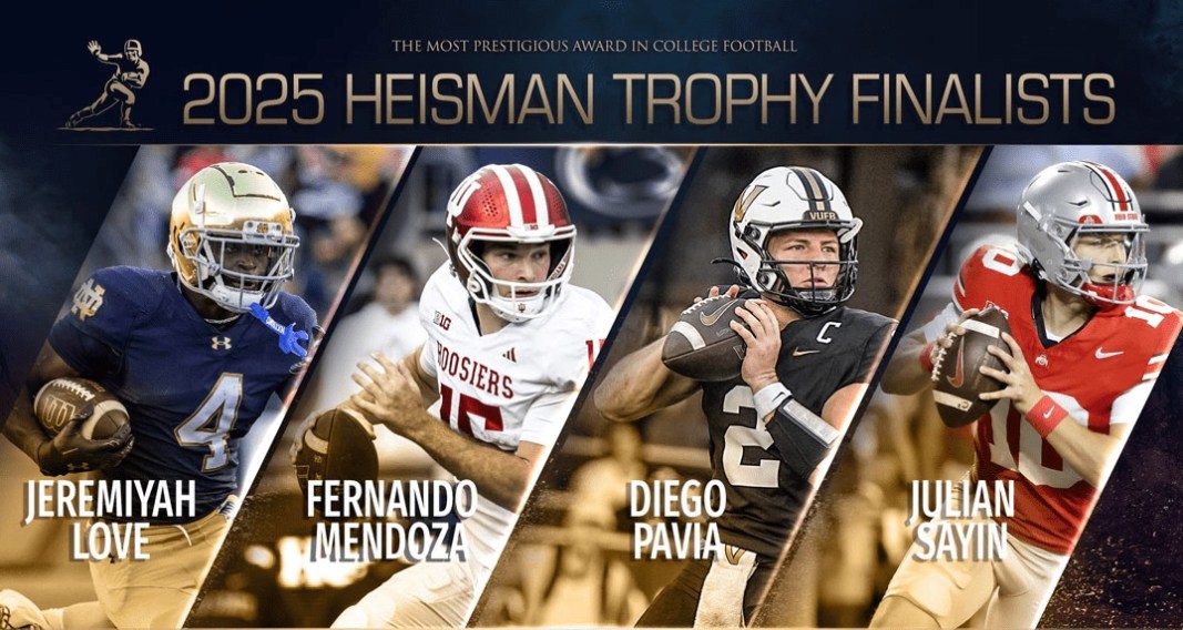 NEW YORK (December 8, 2025) – Notre Dame running back Jeremiyah Love, Indiana quarterback Fernando Mendoza, Vanderbilt quarterback Diego Pavia, and Ohio State quarterback Julian Sayin were named finalists for the 91st Annual Heisman Memorial Trophy tonight (Dec. 8), announced live on ESPN’s Monday Night Countdown.